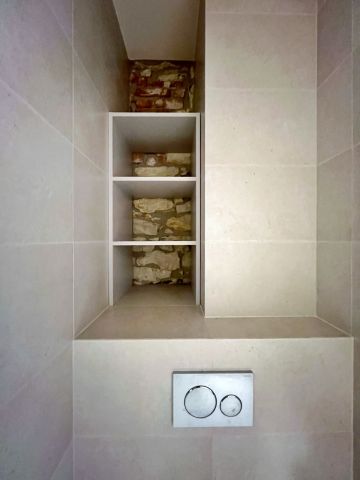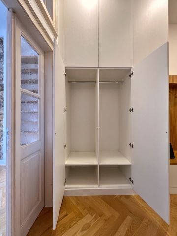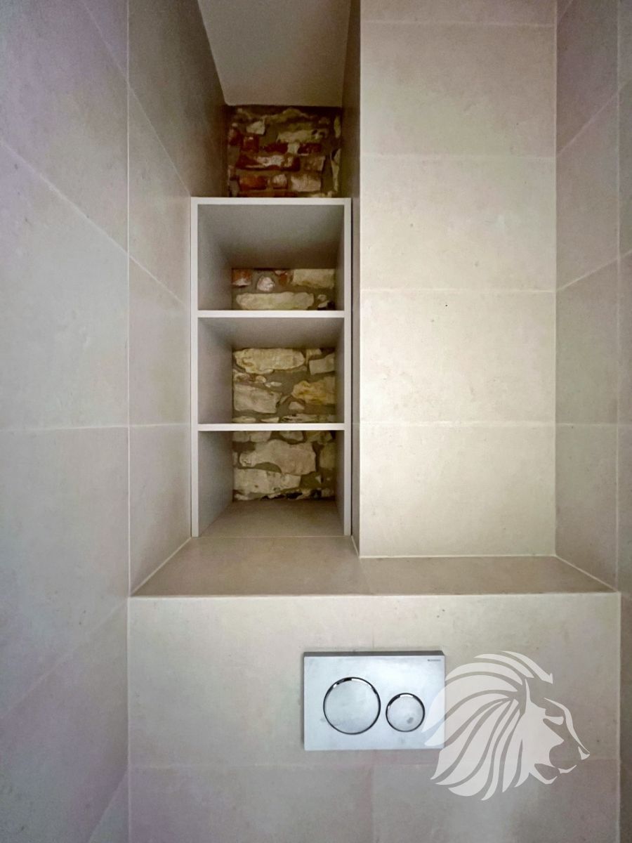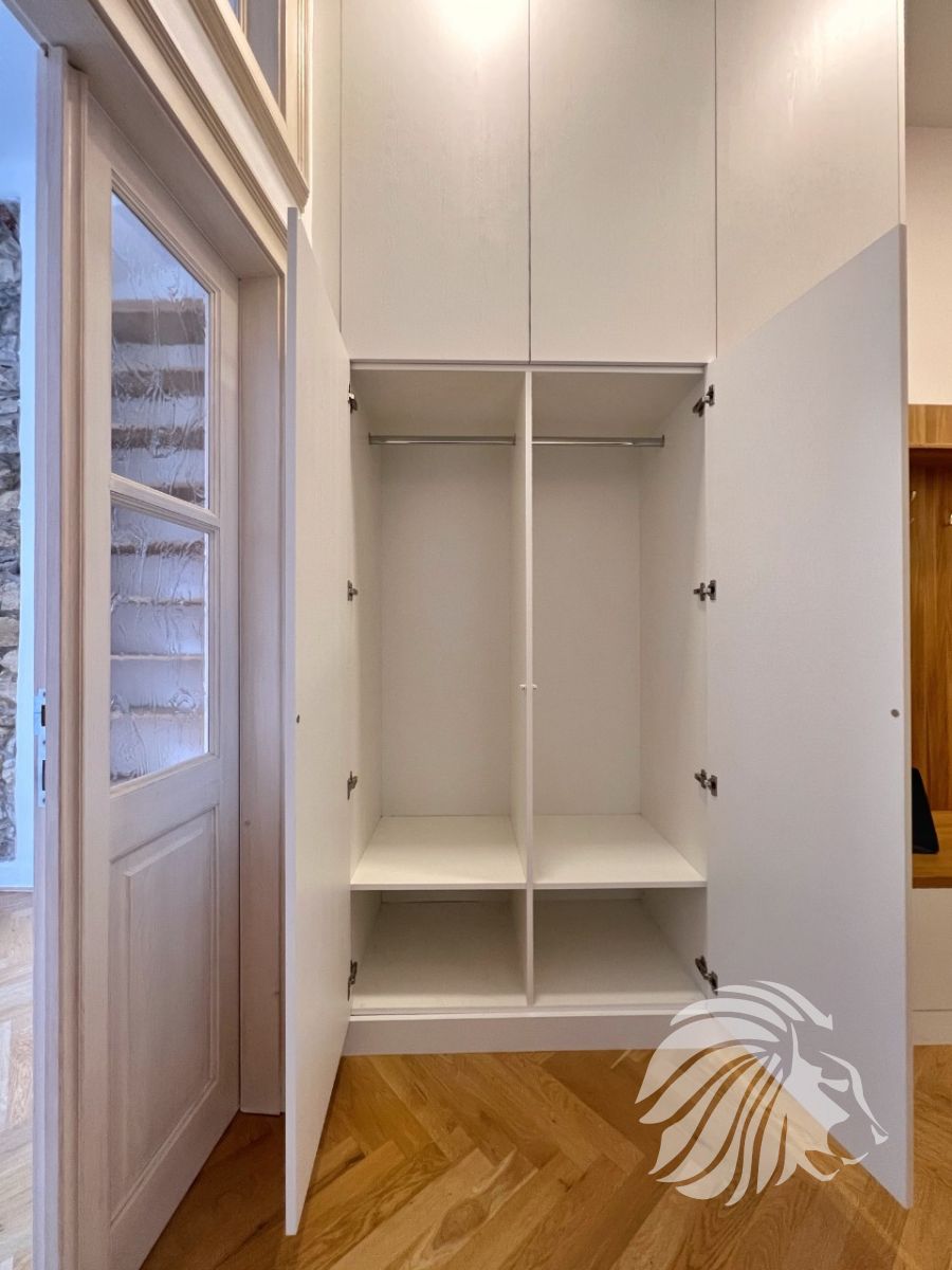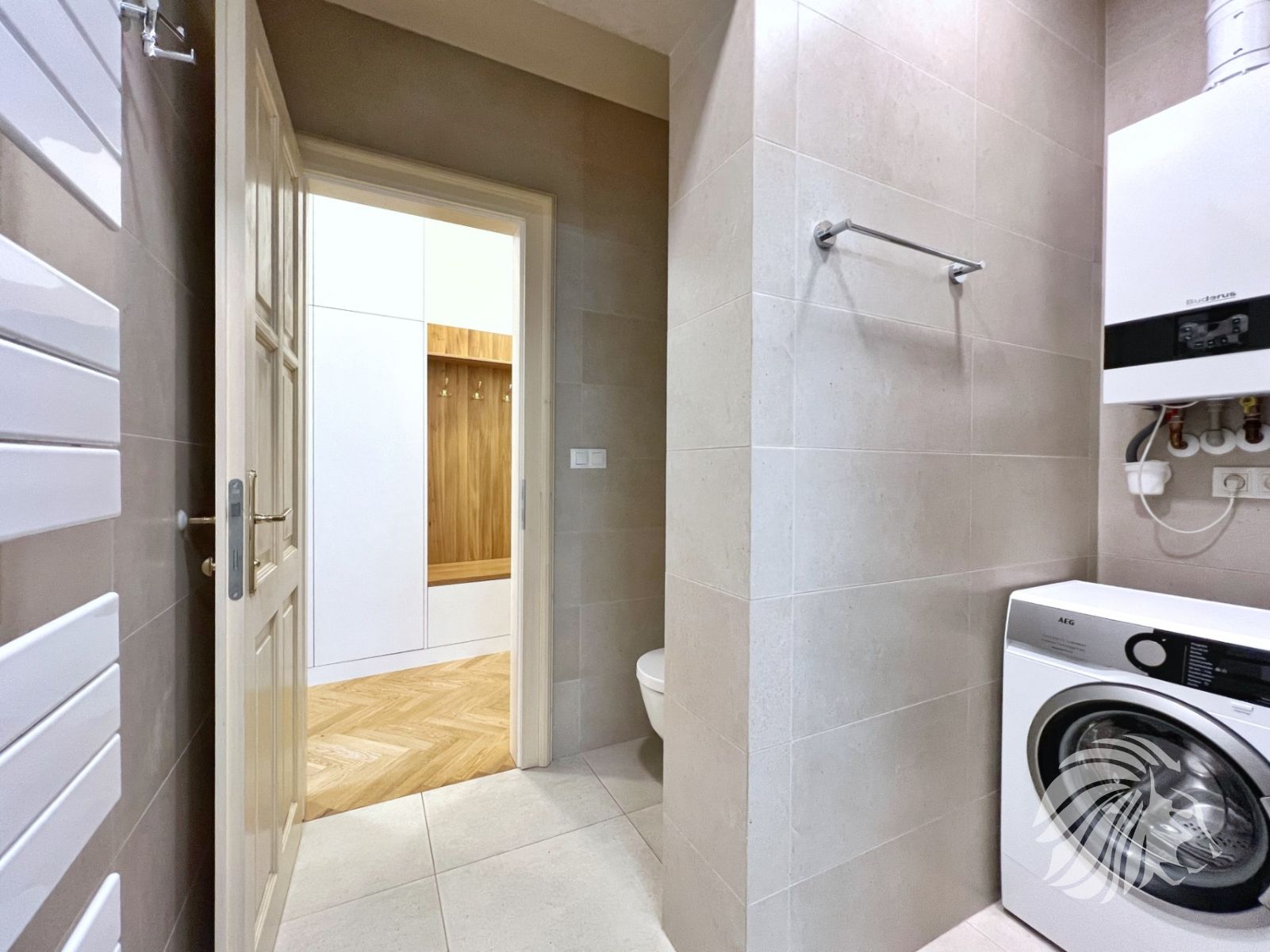 Byt je po generální a velmi zdařilé rekonstrukci s důrazem kladeným na přírodní materiály (dřevo) a spoustu úložného prostoru. V bytě dominují zdi s přiznaným kamenným zdivem v obou místnostech i na WC.