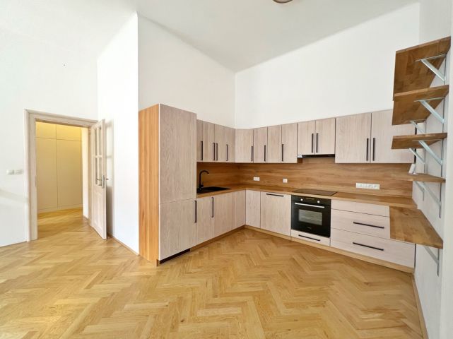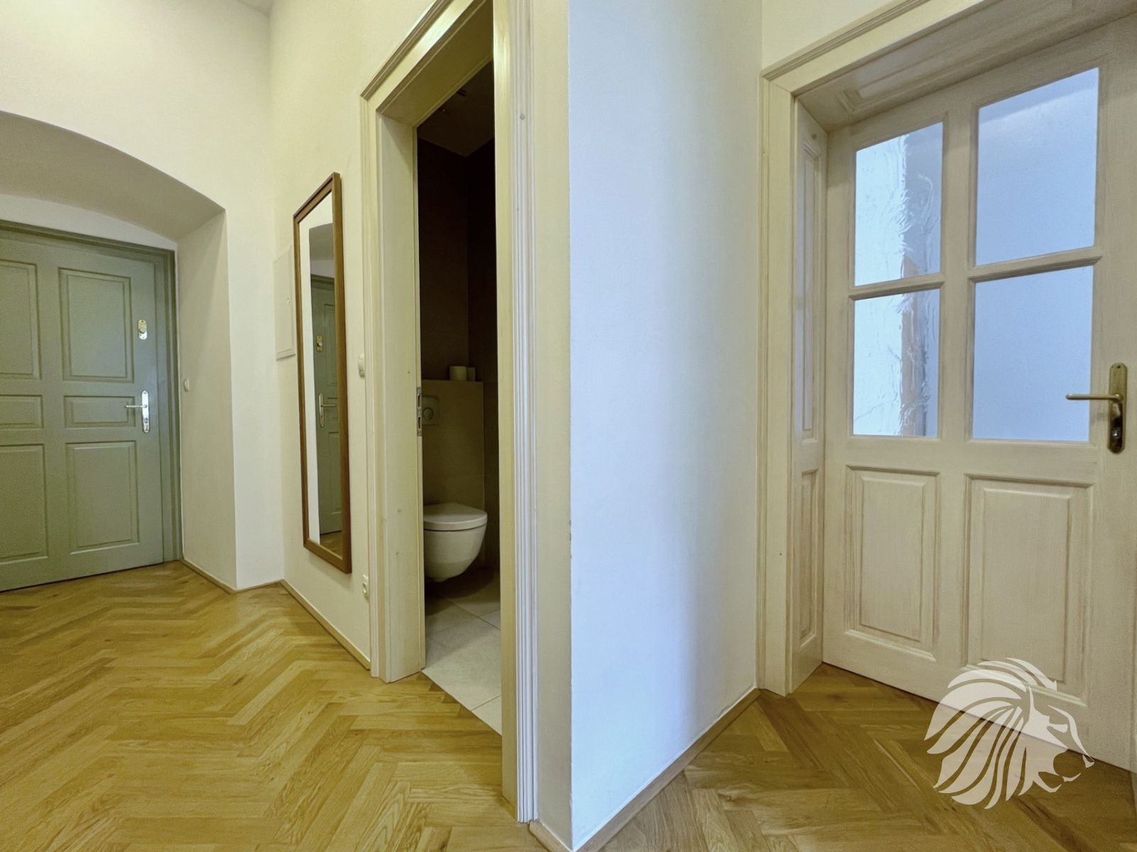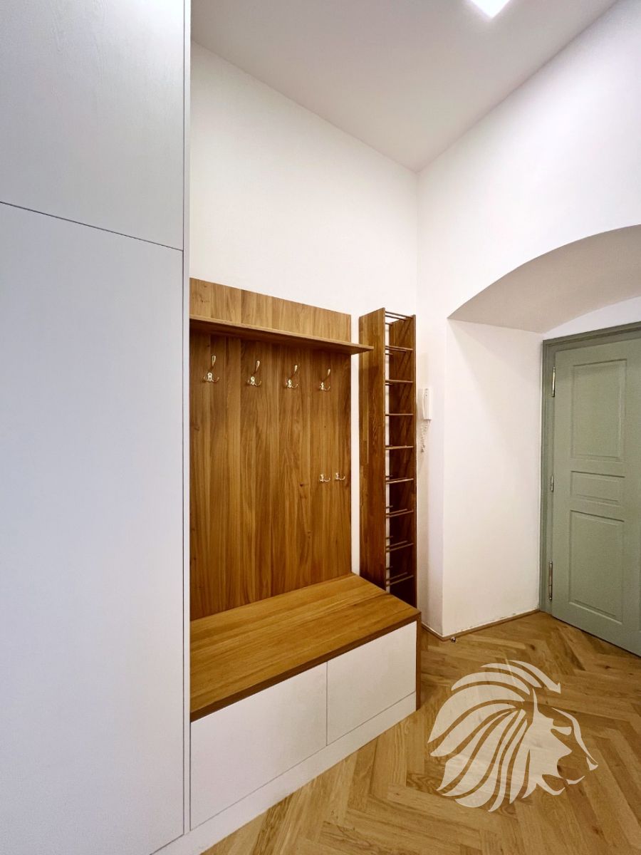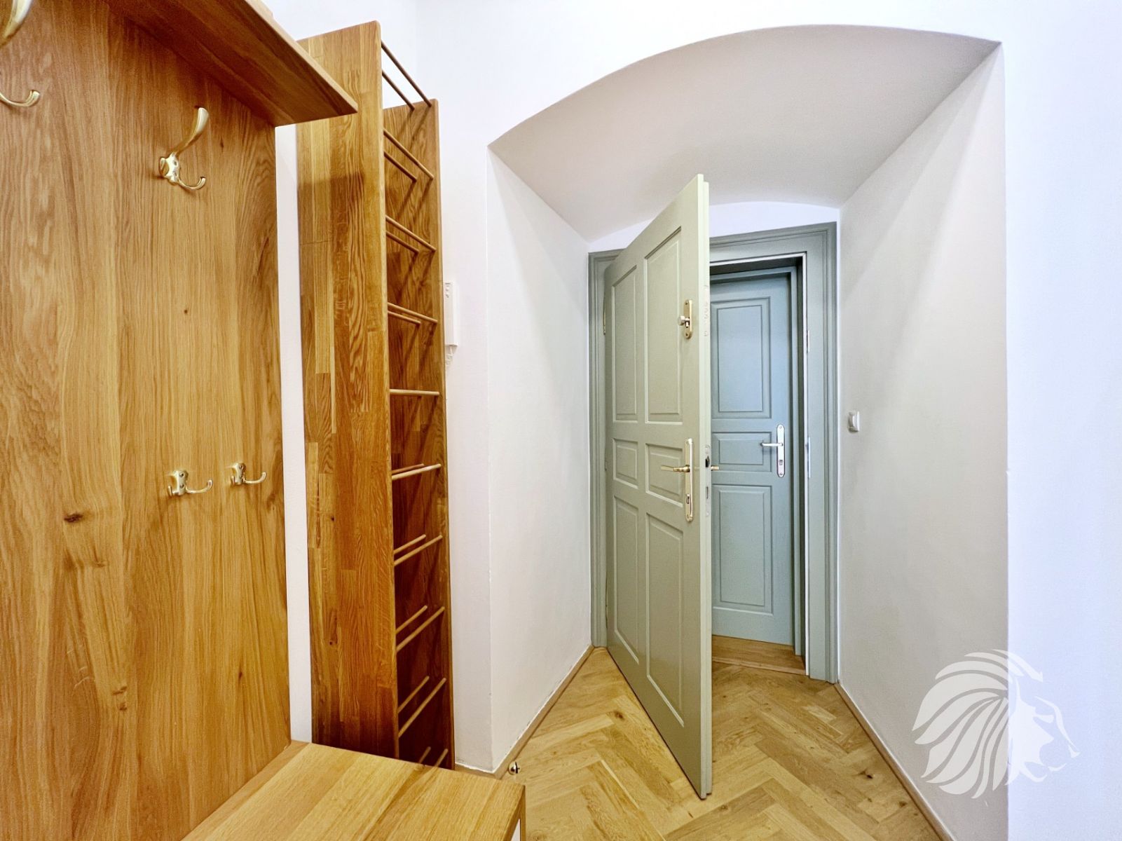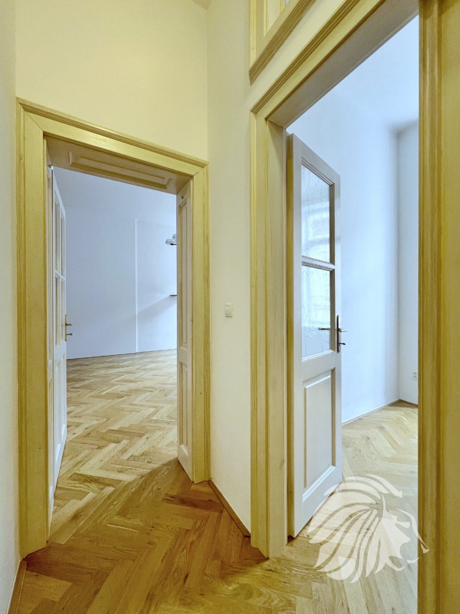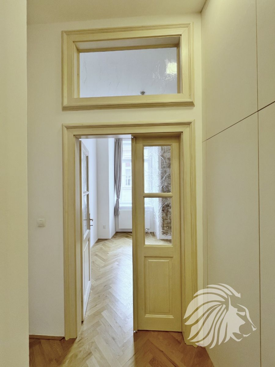 Byt po kompletní rekonstrukci o výměře 47,4 m² je situován ve 2.patře domu bez výtahu. Vstup do bytu vede průchodem, dále nádhernými společnými prostorami a pavlačí. Pavlač a bytovou jednotku rozdělují dvojité dveře. Součástí bytu je nádherně zrekonstruovaný sklep v suterénu domu o výměře 4,9 m².