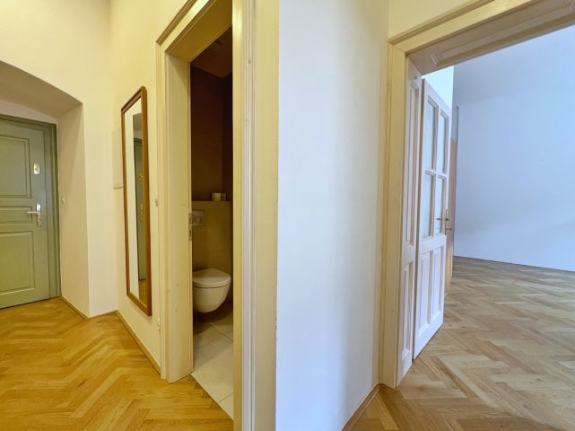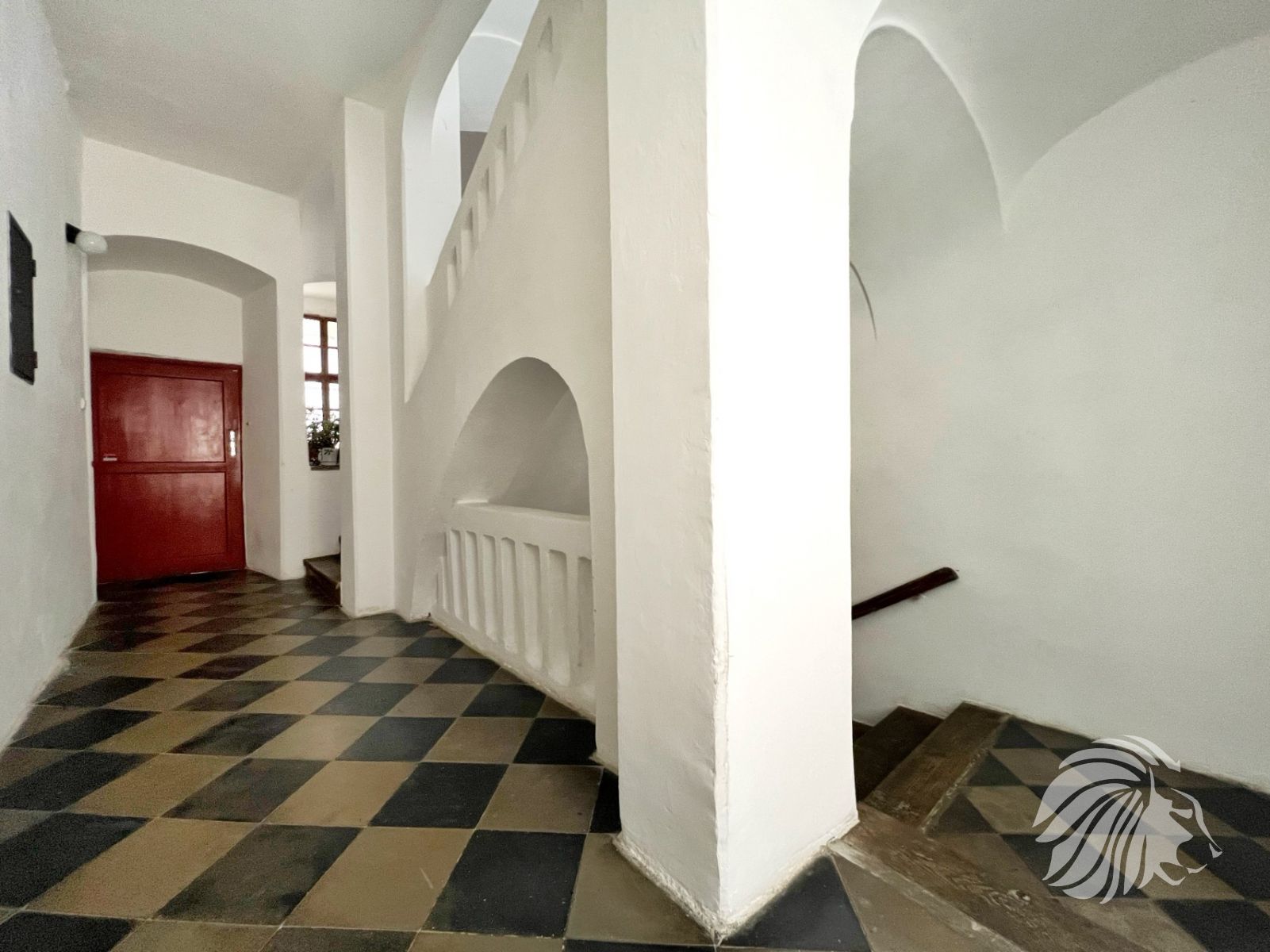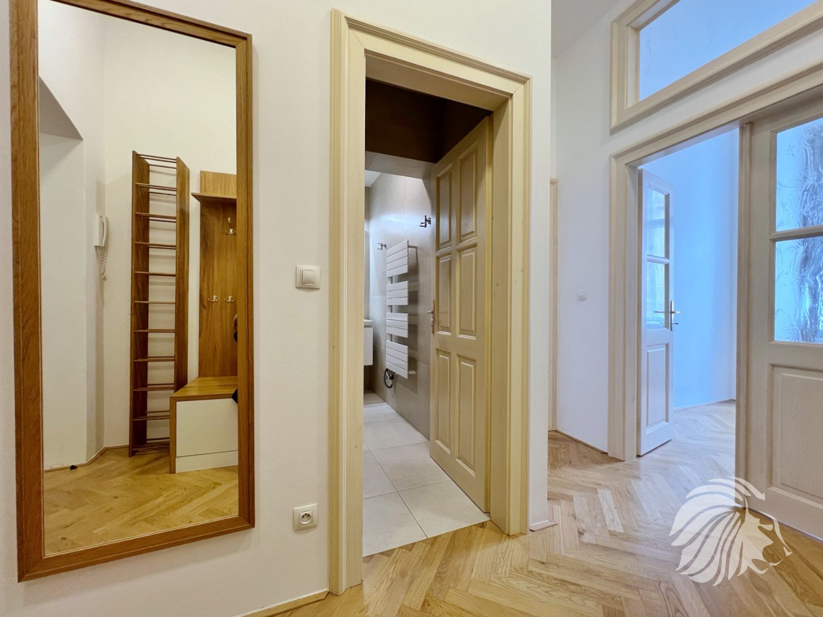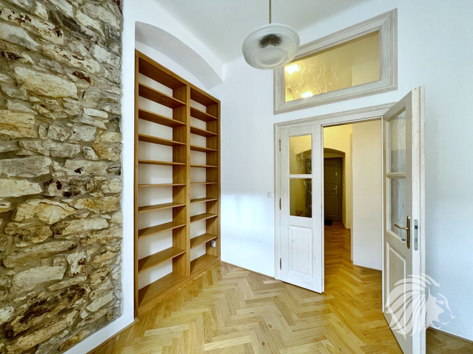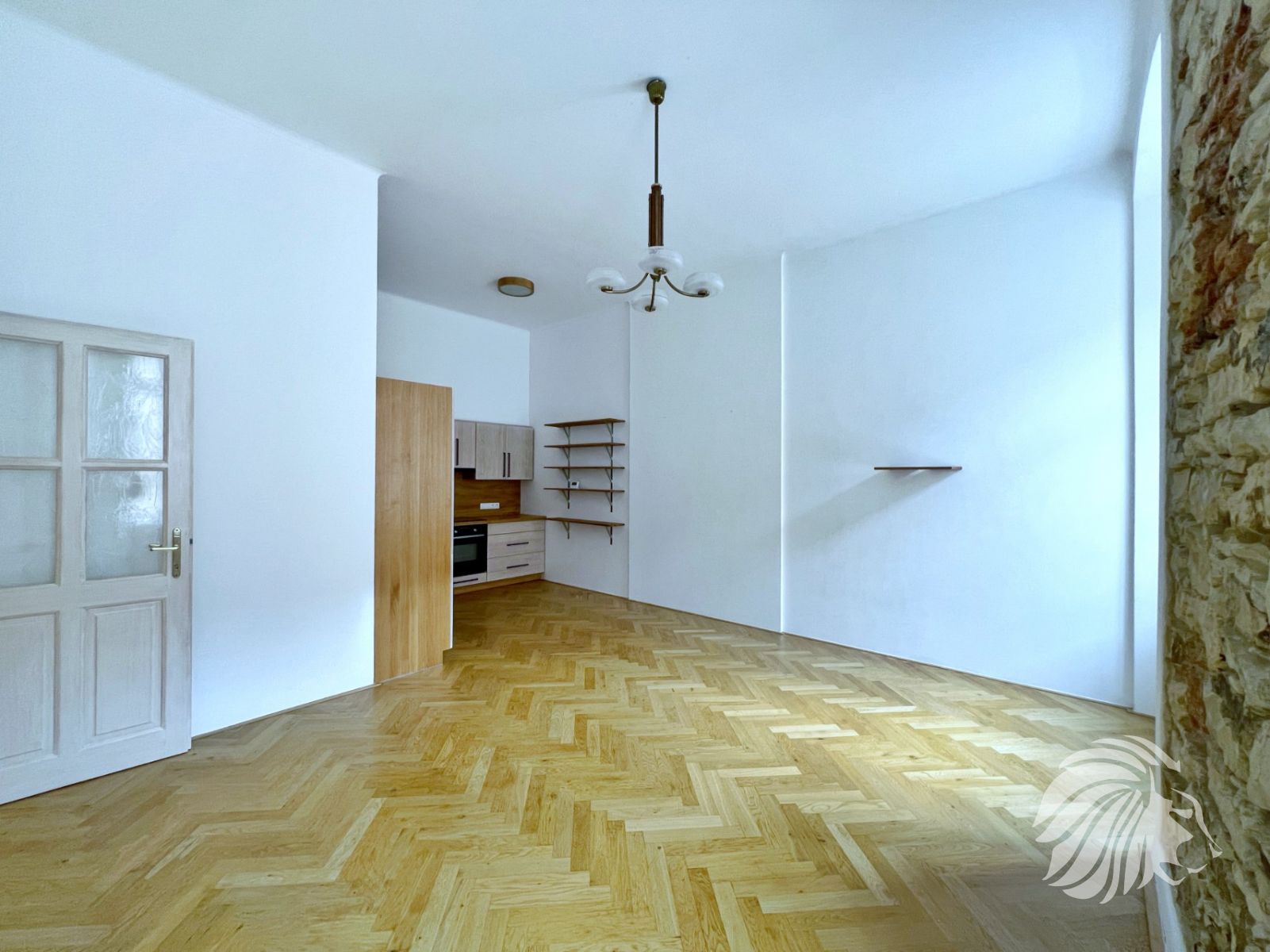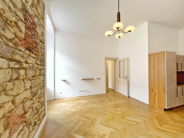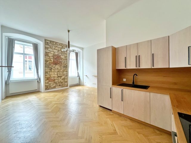 Byt po kompletní rekonstrukci o výměře 47,4 m² je situován ve 2.patře domu bez výtahu. Vstup do bytu vede průchodem, dále nádhernými společnými prostorami a pavlačí. Pavlač a bytovou jednotku rozdělují dvojité dveře. Součástí bytu je nádherně zrekonstruovaný sklep v suterénu domu o výměře 4,9 m².