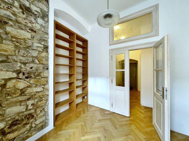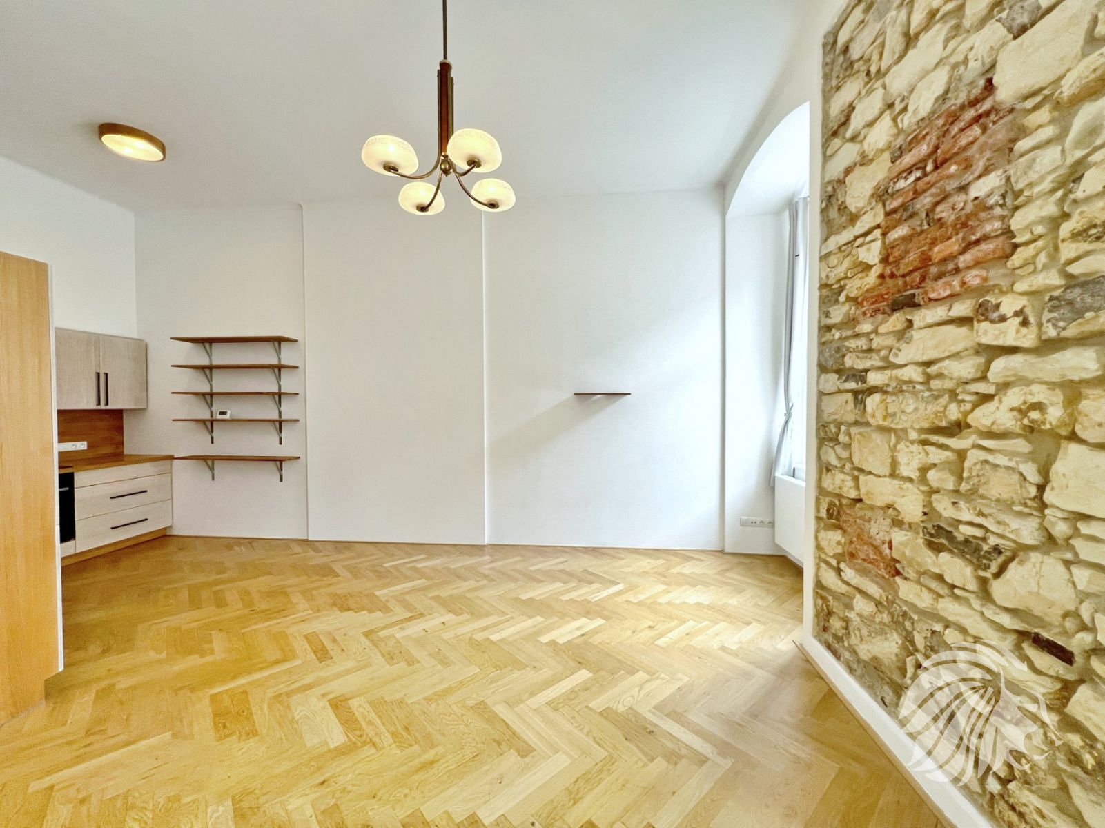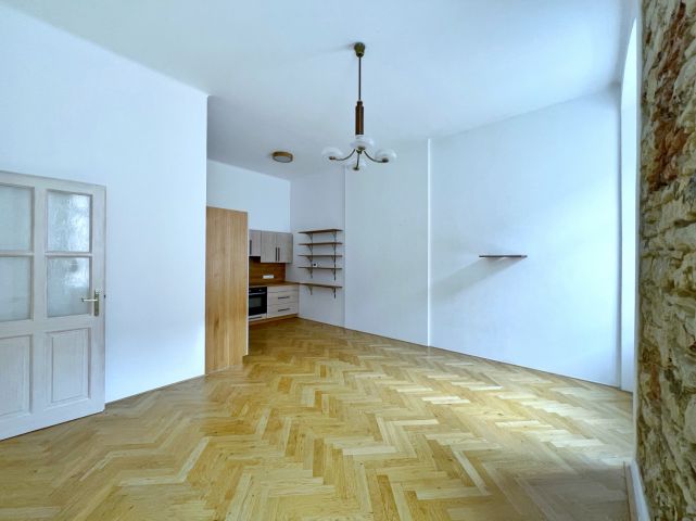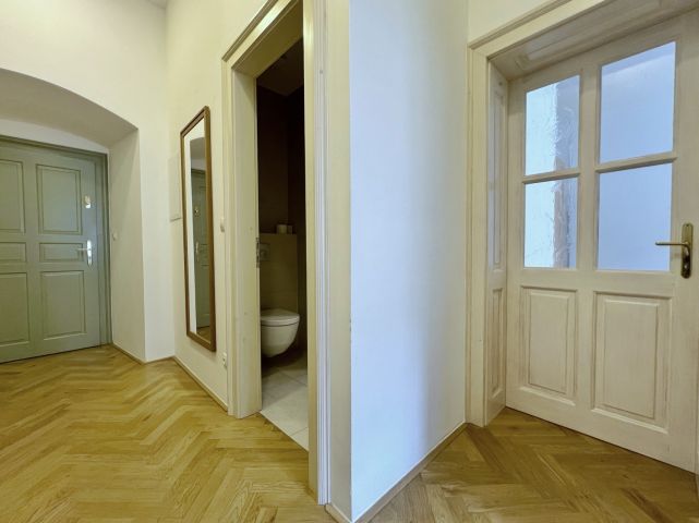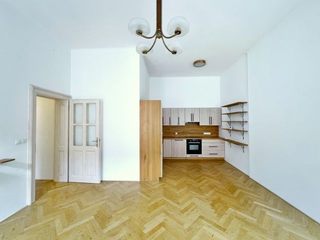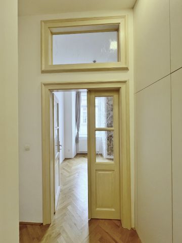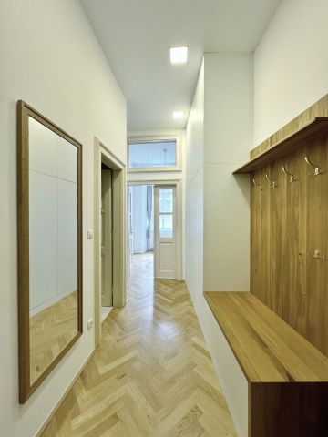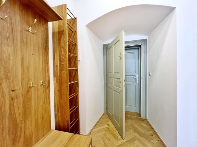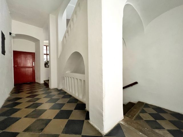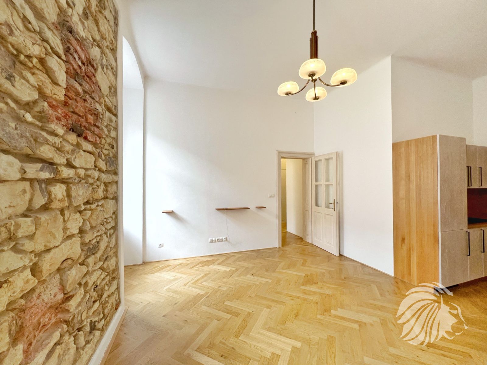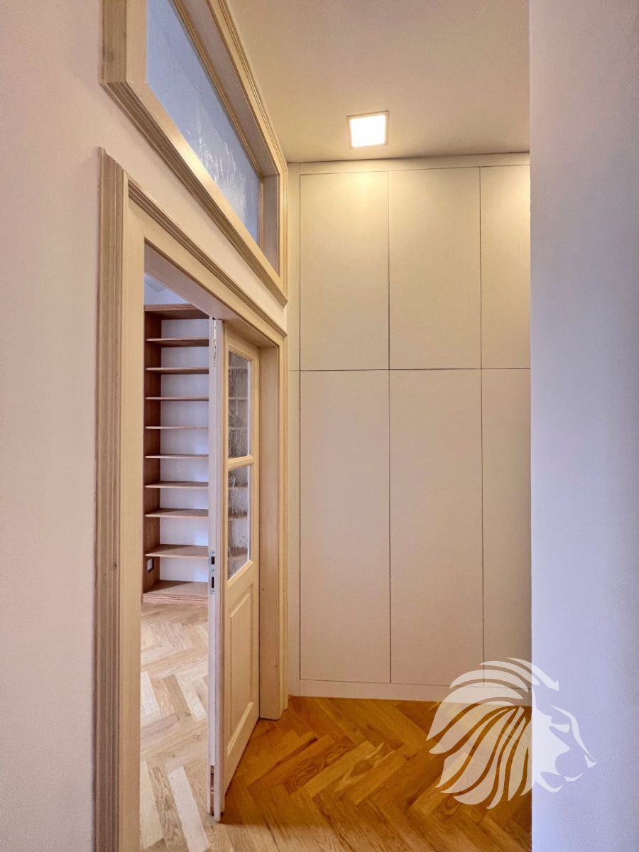 Byt po kompletní rekonstrukci o výměře 47,4 m² je situován ve 2.patře domu bez výtahu. Vstup do bytu vede průchodem, dále nádhernými společnými prostorami a pavlačí. Pavlač a bytovou jednotku rozdělují dvojité dveře. Součástí bytu je nádherně zrekonstruovaný sklep v suterénu domu o výměře 4,9 m².