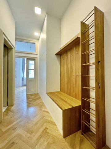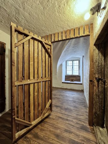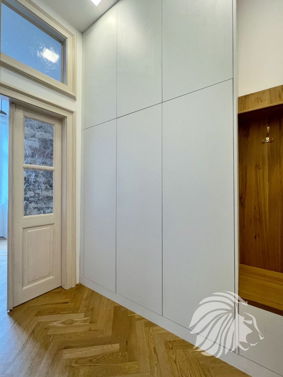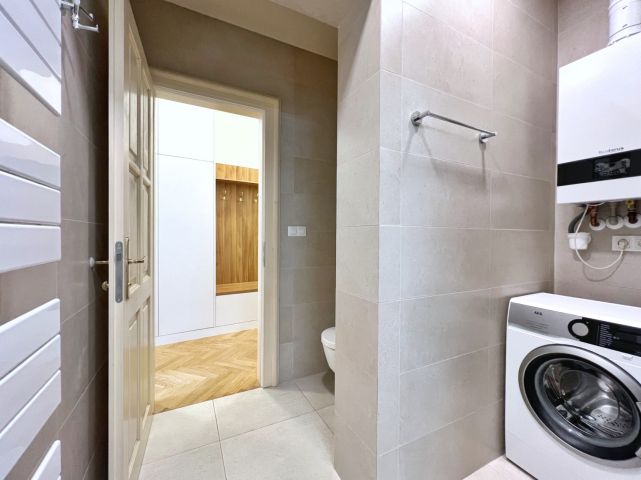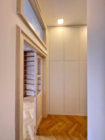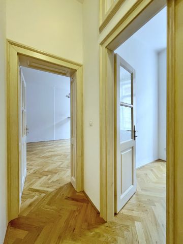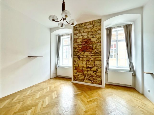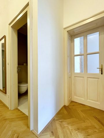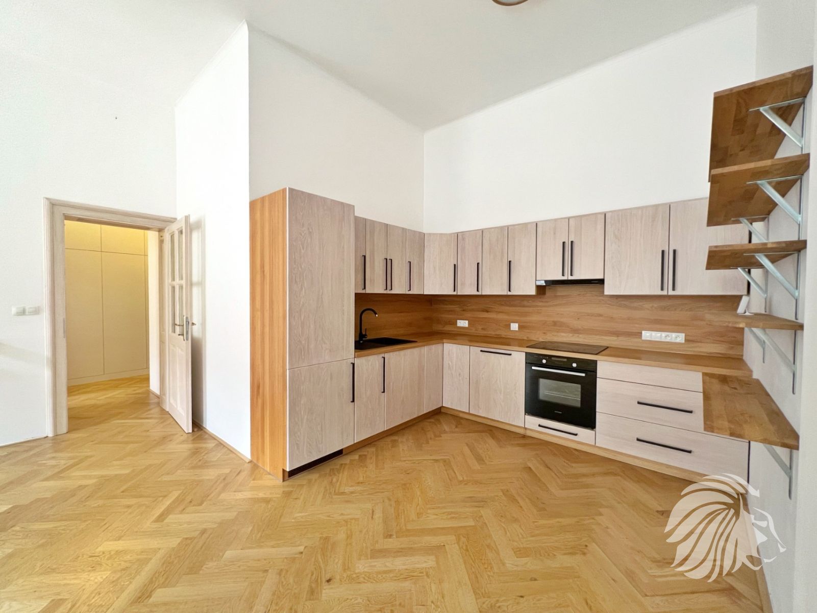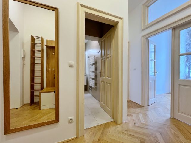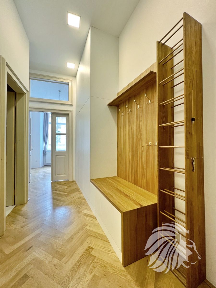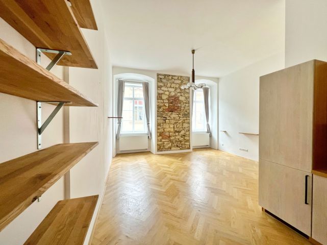 Byt po kompletní rekonstrukci o výměře 47,4 m² je situován ve 2.patře domu bez výtahu. Vstup do bytu vede průchodem, dále nádhernými společnými prostorami a pavlačí. Pavlač a bytovou jednotku rozdělují dvojité dveře. Součástí bytu je nádherně zrekonstruovaný sklep v suterénu domu o výměře 4,9 m².