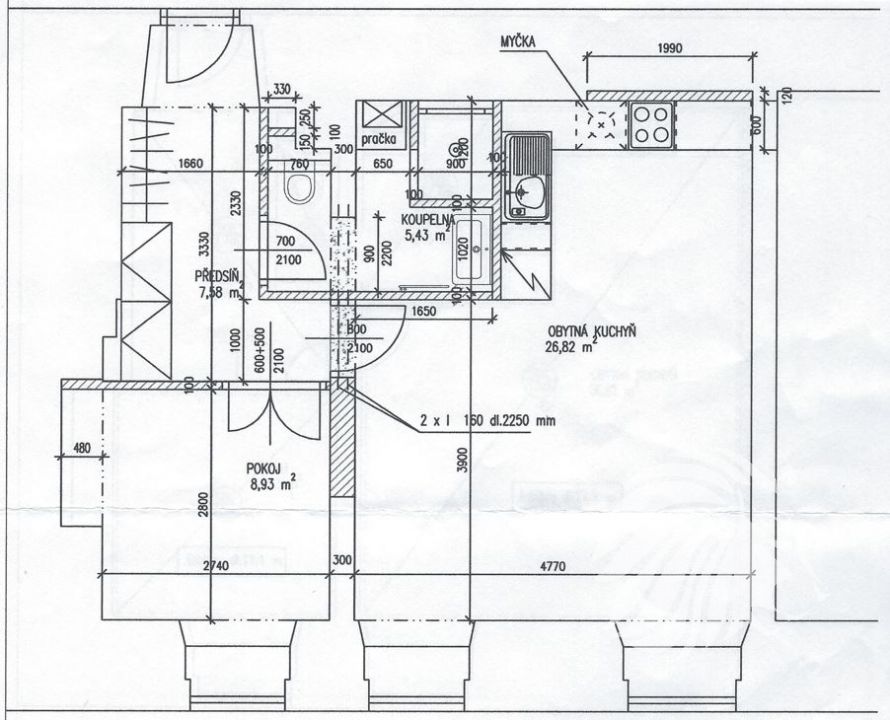 Vstupní chodba, koupelna s WC, pokoj s kuchyňským koutem, ložnice + stylově zrekonstruovaný sklep.