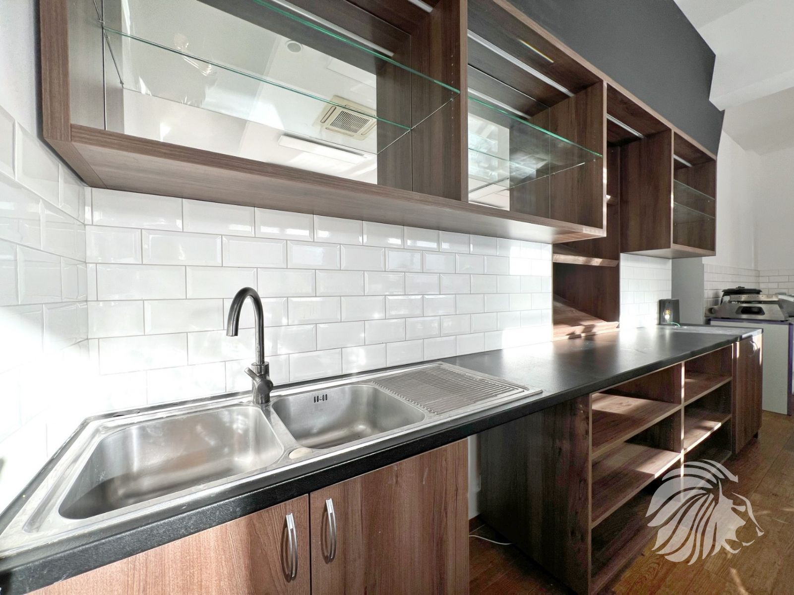 Podlahy: dlažba v dekoru dřeva, vyjma v místnosti s kuch linkou a chodeb,