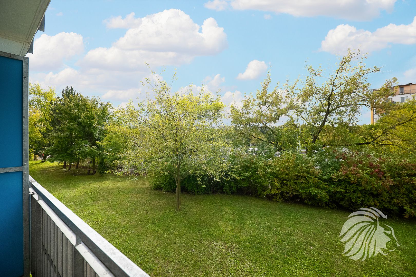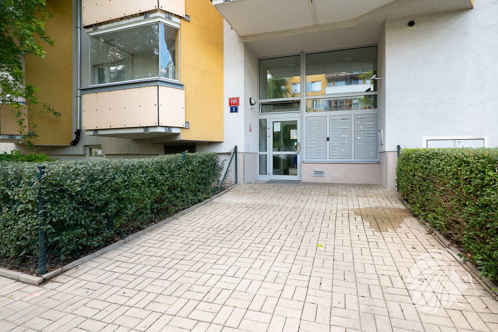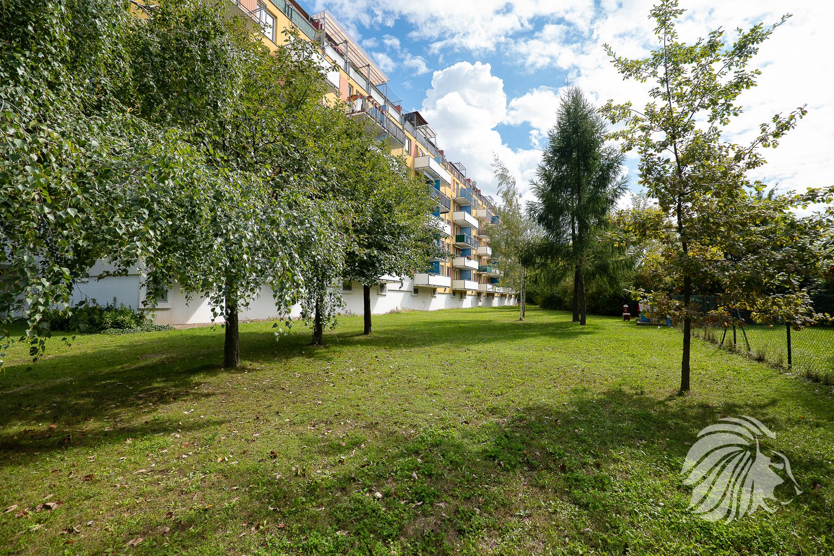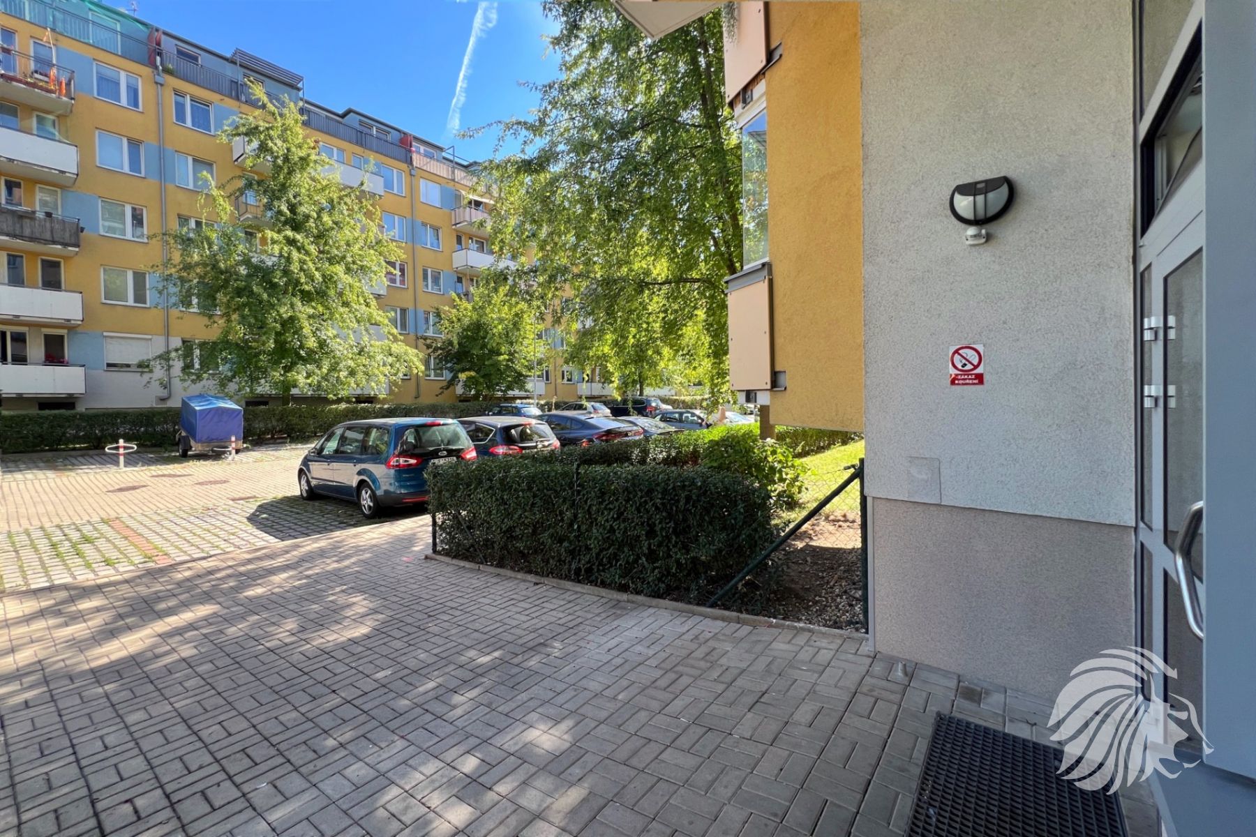 Byt se nachází v části domu, která je od hlavní chodby s výtahem oddělena samostatnými dveřmi na čip – přístup mají pouze vlastníci bytů z daného křídla. Obě místnosti a balkon jsou orientovány na západ a nabízejí výhled na zahradu se vzrostlou zelení. Za zahradou je rozlehlé placené parkoviště, což spolu se zahradou poskytuje značné odclonění od ruchu hlavní ulice – klid v bytě je tak prakticky zaručen. Uzamykatelná oplocená zahrada je určena výhradně vlastníkům bytů v domě.