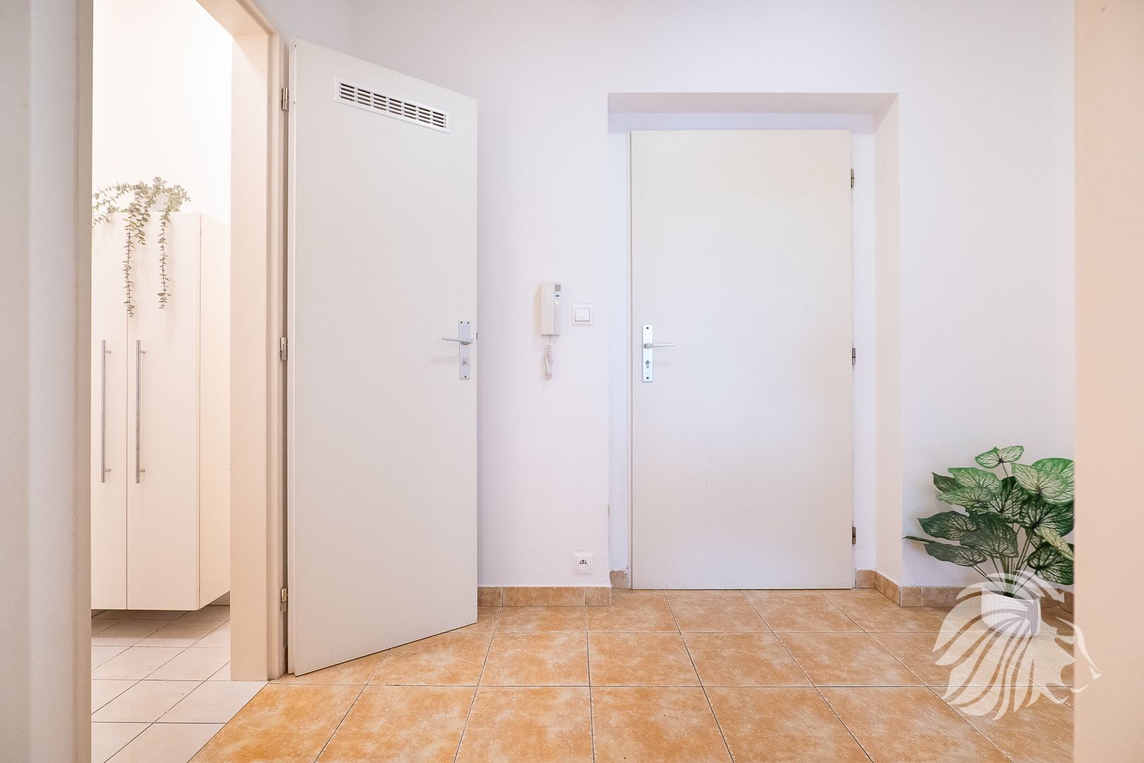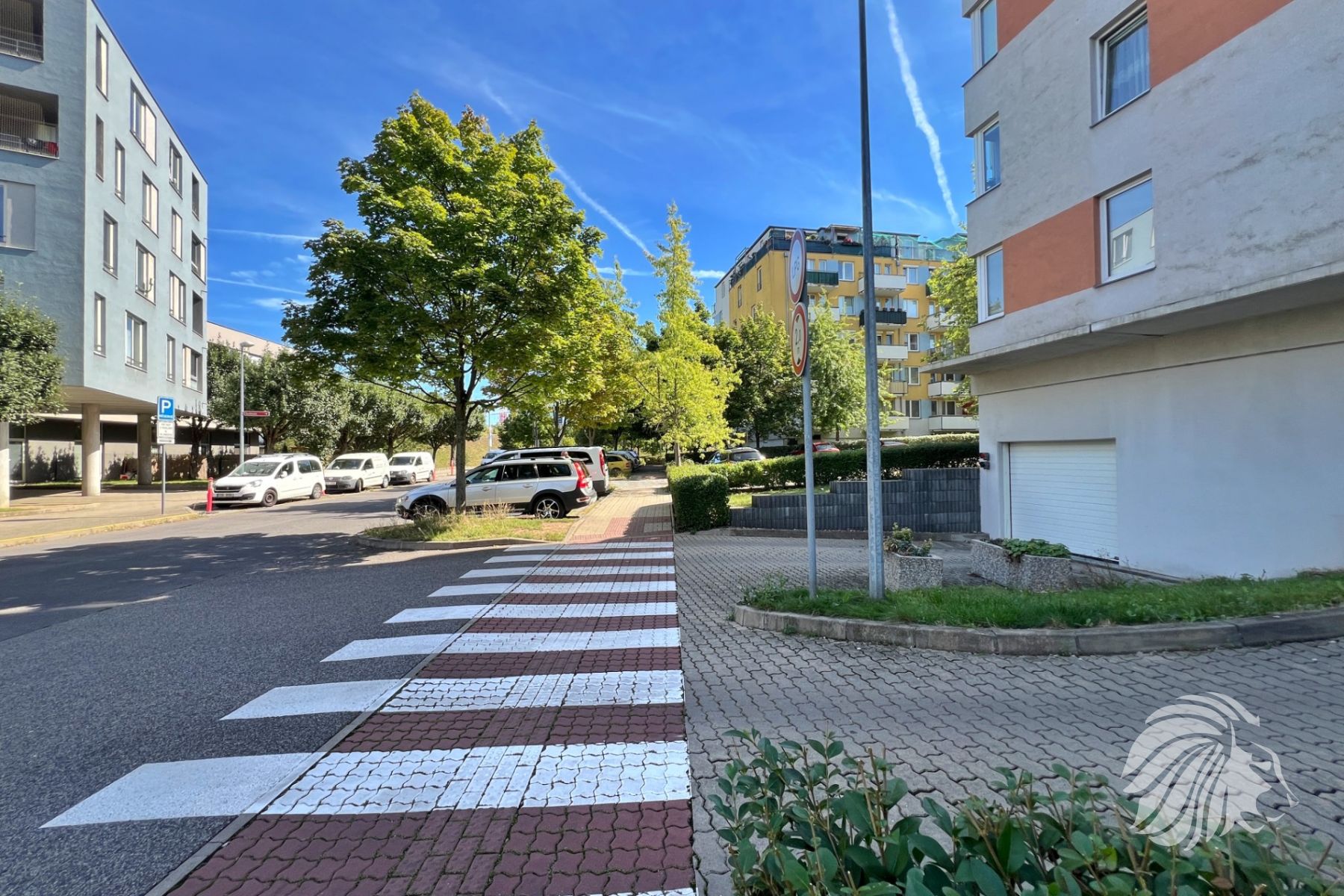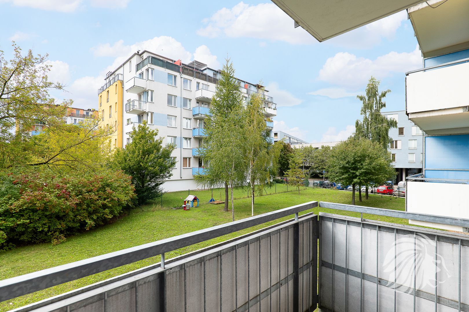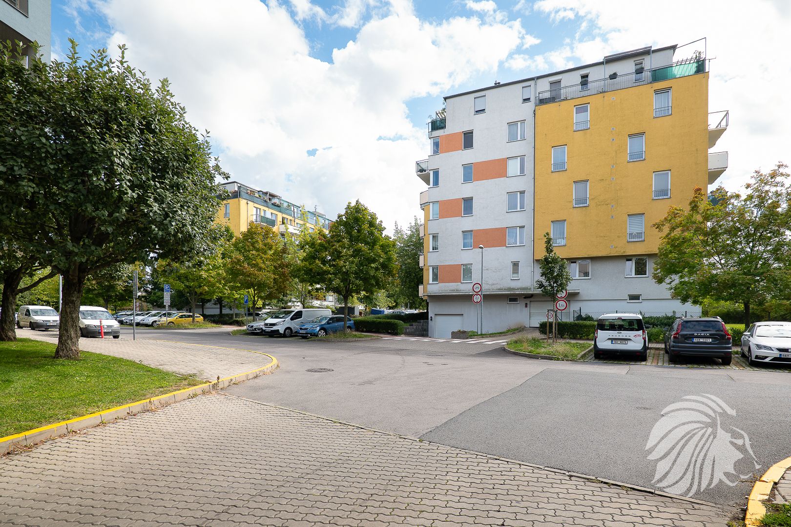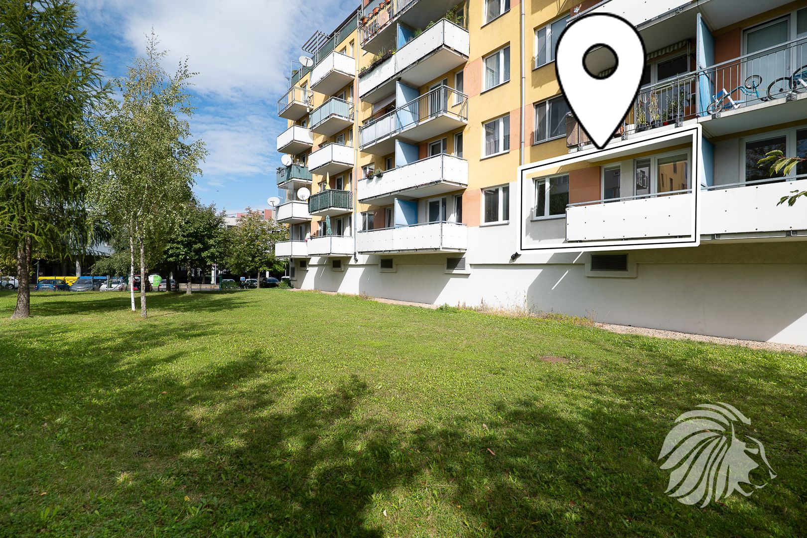 Byt se nachází v části domu, která je od hlavní chodby s výtahem oddělena samostatnými dveřmi na čip – přístup mají pouze vlastníci bytů z daného křídla. Obě místnosti a balkon jsou orientovány na západ a nabízejí výhled na zahradu se vzrostlou zelení. Za zahradou je rozlehlé placené parkoviště, což spolu se zahradou poskytuje značné odclonění od ruchu hlavní ulice – klid v bytě je tak prakticky zaručen. Uzamykatelná oplocená zahrada je určena výhradně vlastníkům bytů v domě.