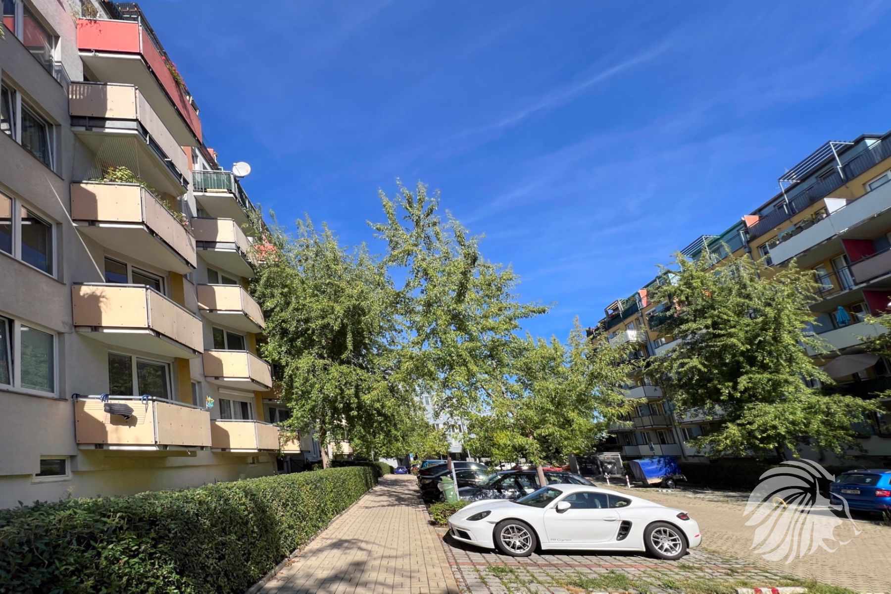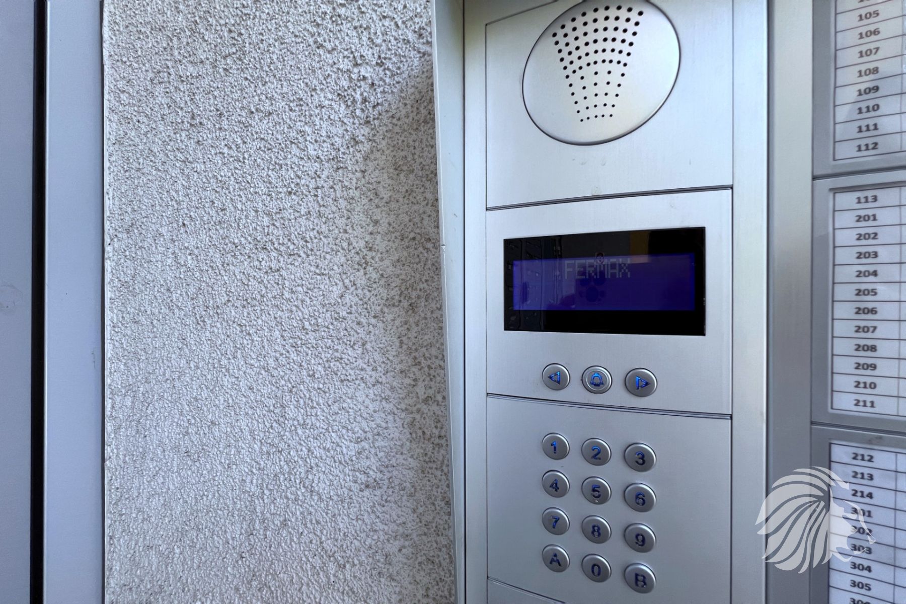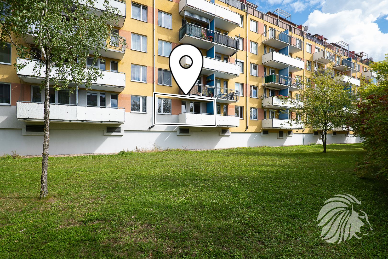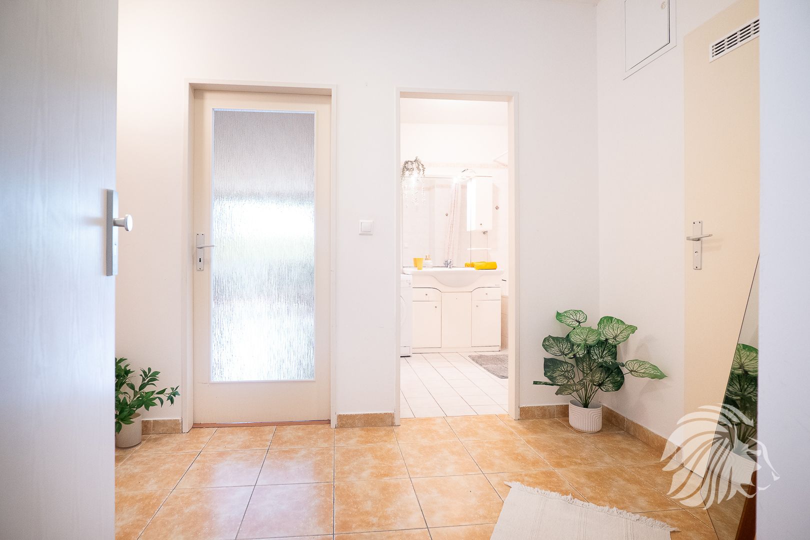 Byt se nachází v části domu, která je od hlavní chodby s výtahem oddělena samostatnými dveřmi na čip – přístup mají pouze vlastníci bytů z daného křídla. Obě místnosti a balkon jsou orientovány na západ a nabízejí výhled na zahradu se vzrostlou zelení. Za zahradou je rozlehlé placené parkoviště, což spolu se zahradou poskytuje značné odclonění od ruchu hlavní ulice – klid v bytě je tak prakticky zaručen. Uzamykatelná oplocená zahrada je určena výhradně vlastníkům bytů v domě.