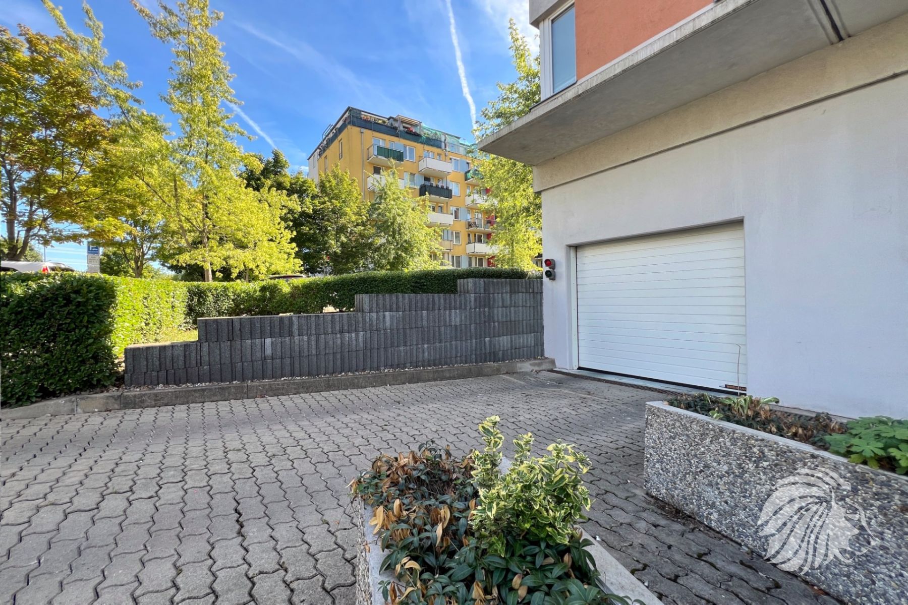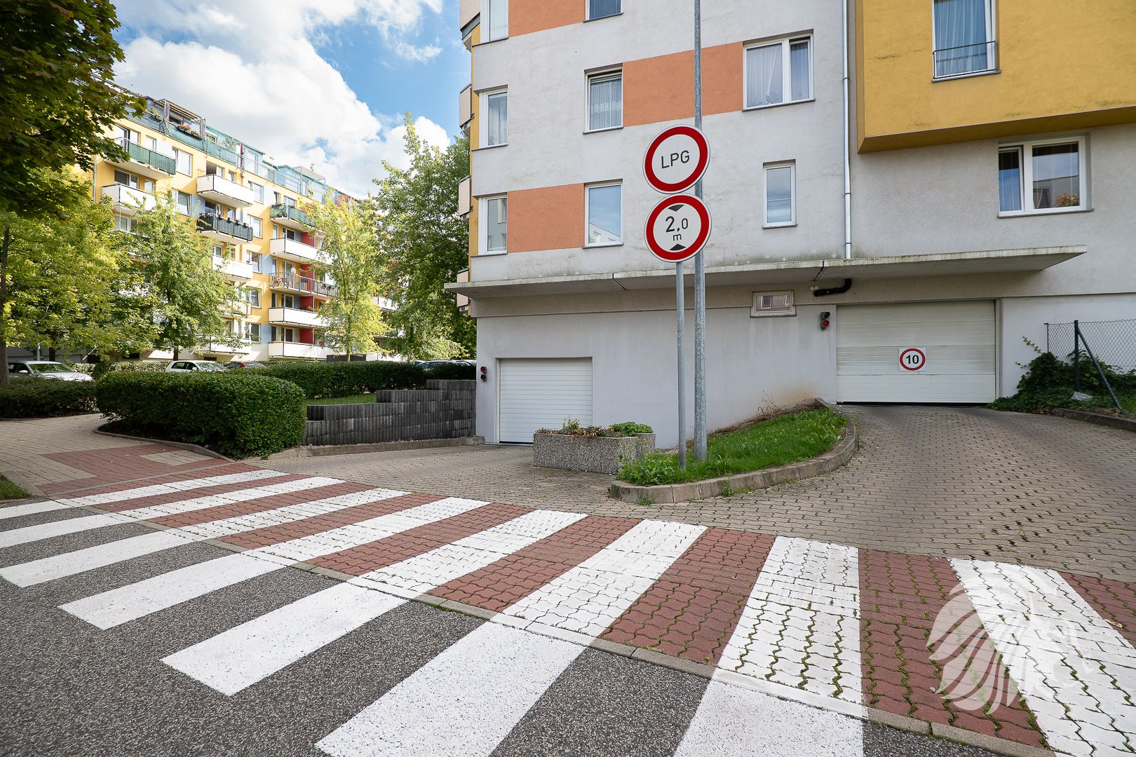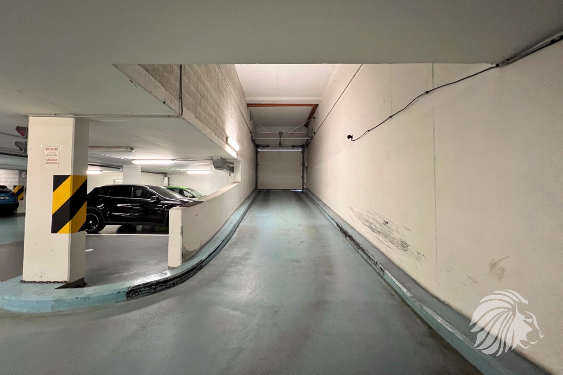 Součástí prodeje je garážové stání v suterénu domu. Vjezd i výjezd je pohodlný a mírný, vrata se otevírají na dálkové ovládání. Výjezd je na boku domu do ulice Terezínská.