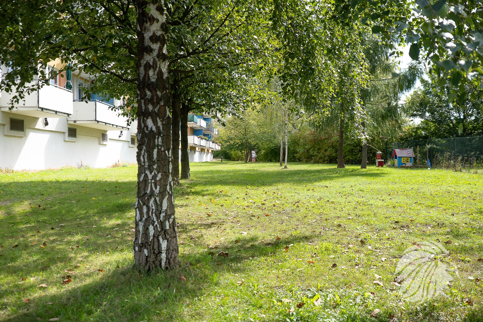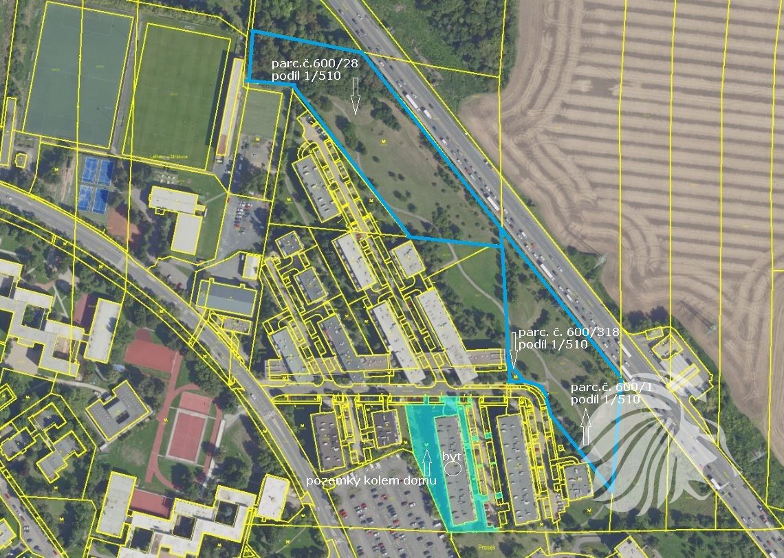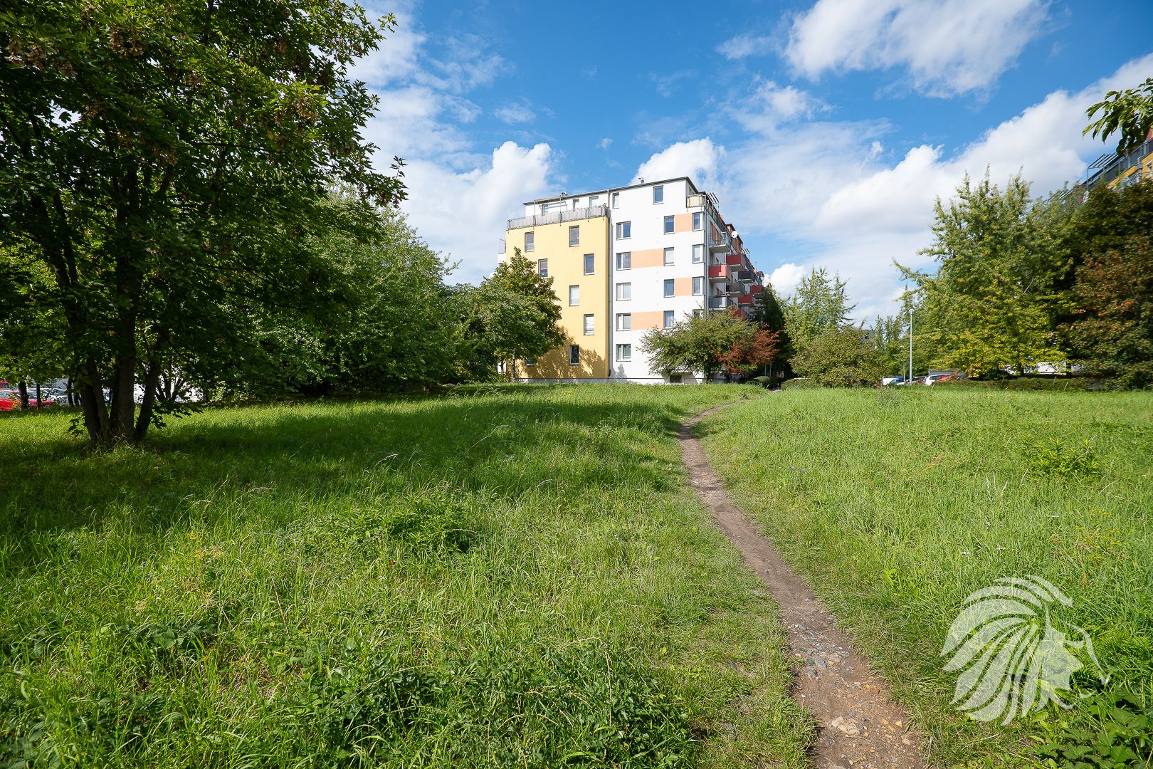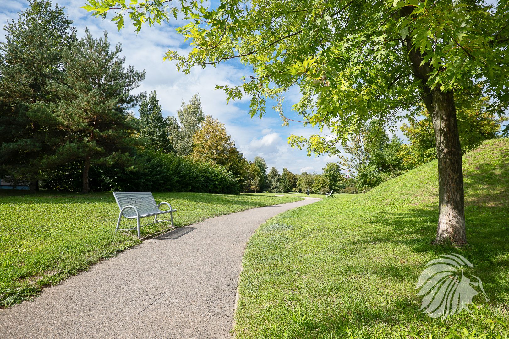 K bytu náleží také podíl na okolních pozemcích. Na západní straně domu je udržovaná zahrada se vzrostlými stromy. V těsné blízkosti se rozkládá rozsáhlý park s bohatou zelení a lavičkami – ideální pro procházky se psem, sport i relaxaci. Váš podíl na něm činí 1/510.