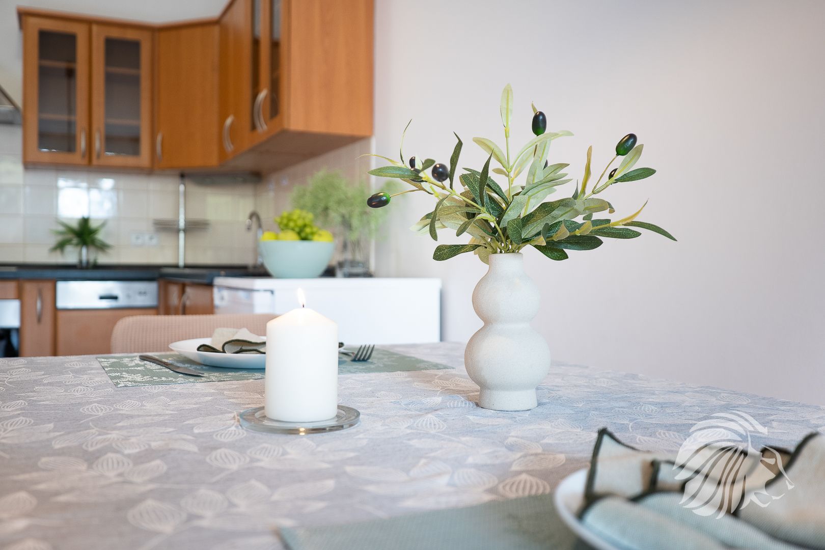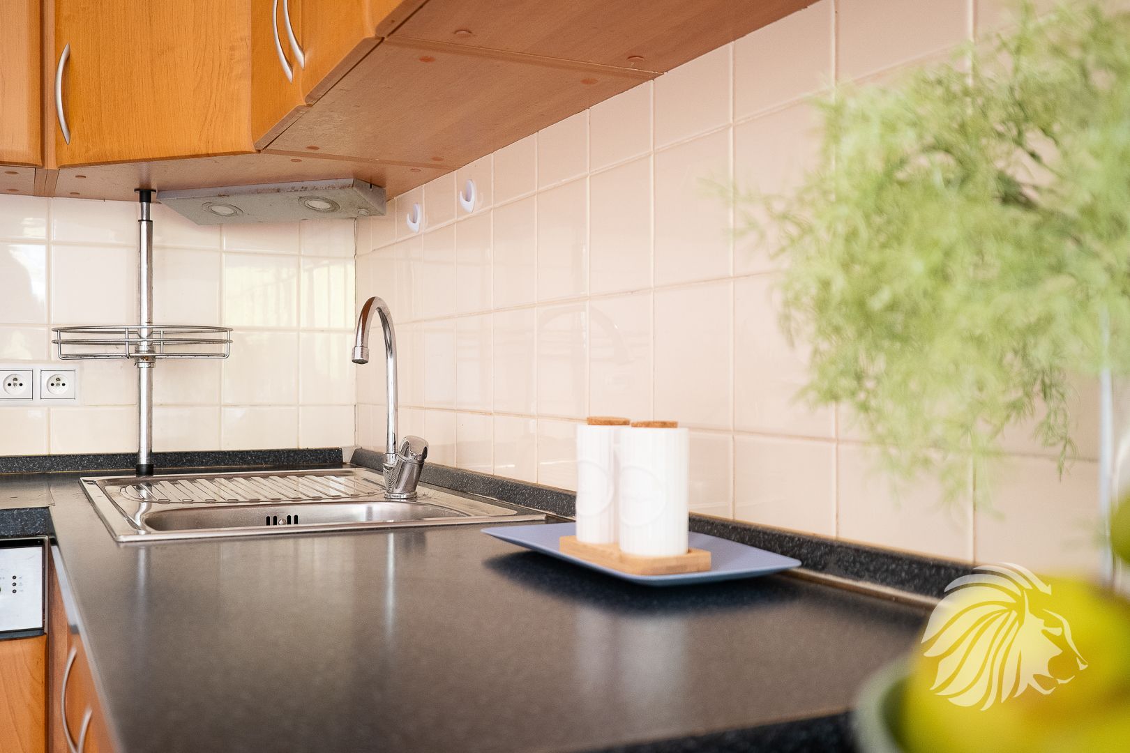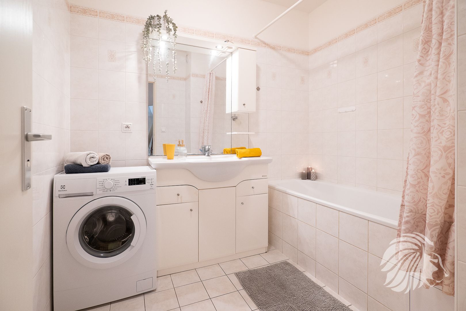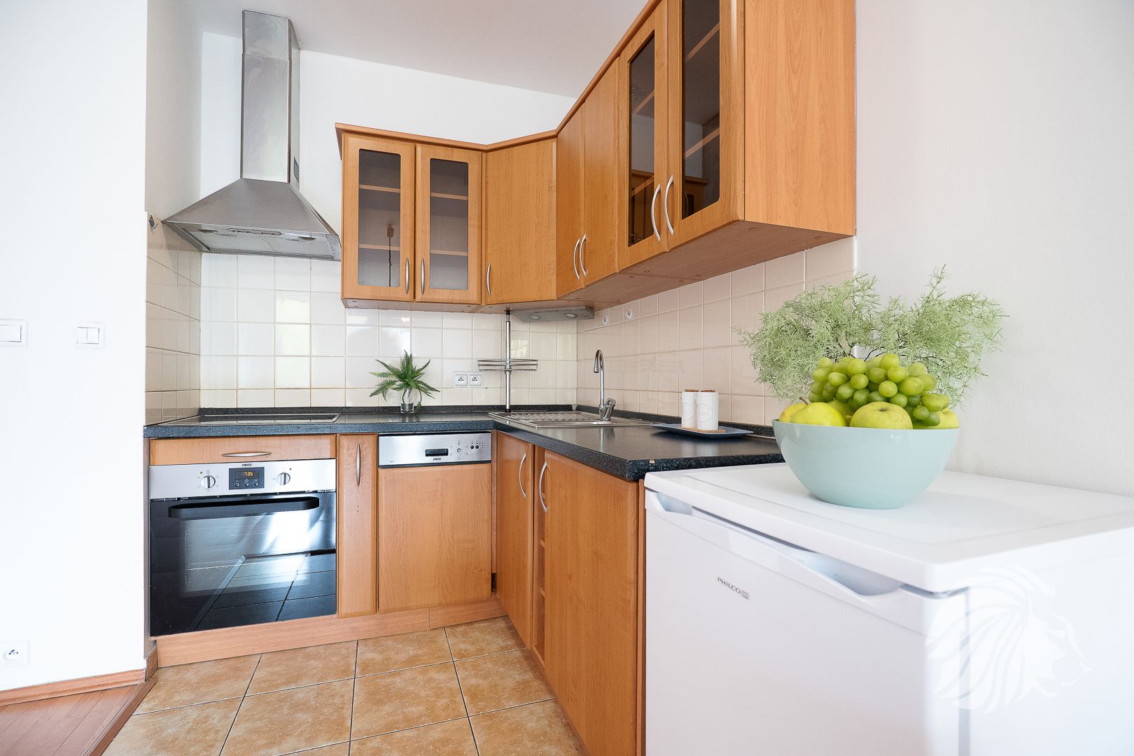 V bytě zůstává původní kuchyňská linka se spotřebiči: digestoř s odtahem do komína, horkovzdušná trouba, sklokeramická varná deska, užší myčka a vestavěná menší lednice. K dispozici je také zcela nová volně stojící lednice (možno přikoupit za 3 980 Kč). V ložnici najdete vestavěnou rohovou skříň, na WC úložnou skříňku a v koupelně koupelnový nábytek spolu s topným žebříkem. Pračka není součástí prodeje, ale přípojka je připravena v koupelně.